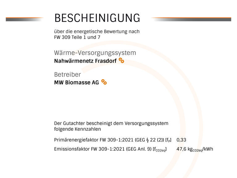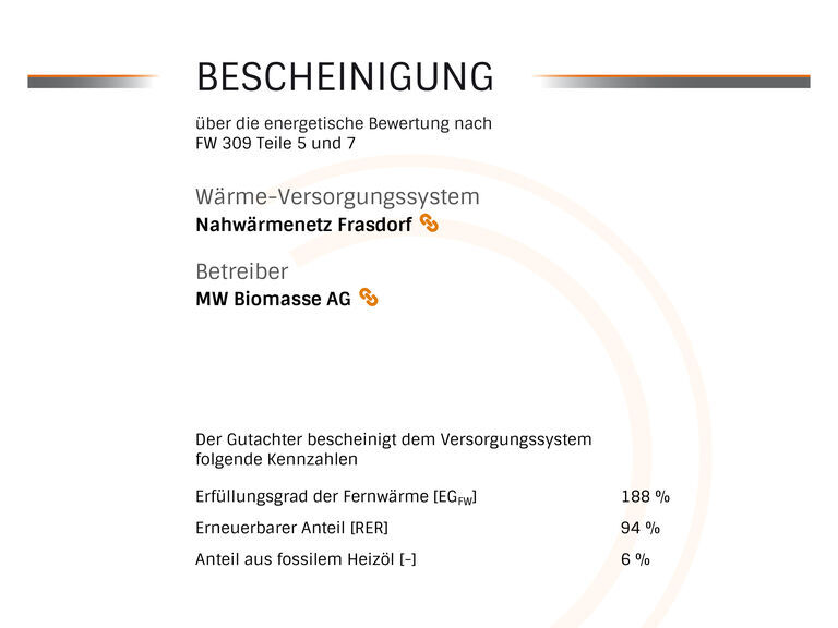 Nah- und Fernwärmesystem werden oft von mehreren Erzeugungsanlagen und verschiedenen Energieträgern gespeist. Im Falle der Anlagen der MWB kommt der weitaus größte Teil aus Hackschnitzeln (erneuerbarer Anteil) und ein kleiner Teil aus Heizöl oder Erdgas (nichterneuerbarer Anteil). Dieses Verhältnis der Anteile wird durch den Erfüllungsgrad der Fernwärme ausgedrückt. Dieser Erfüllungsgrad ist ähnlich wie der Primärenergiefaktor eine netzspezifische Kennzahl, mit der dann die Nachweise für die angeschlossenen Gebäude erbracht werden können.