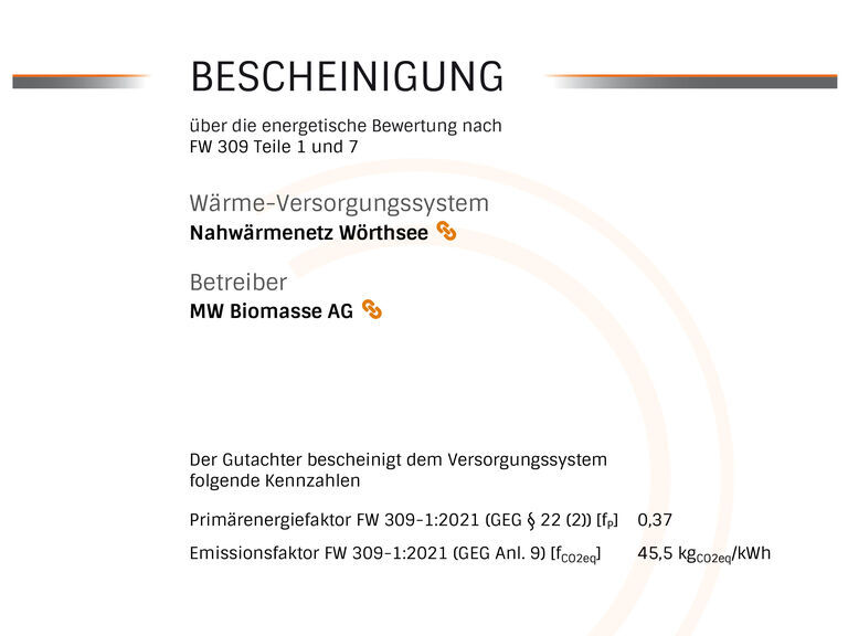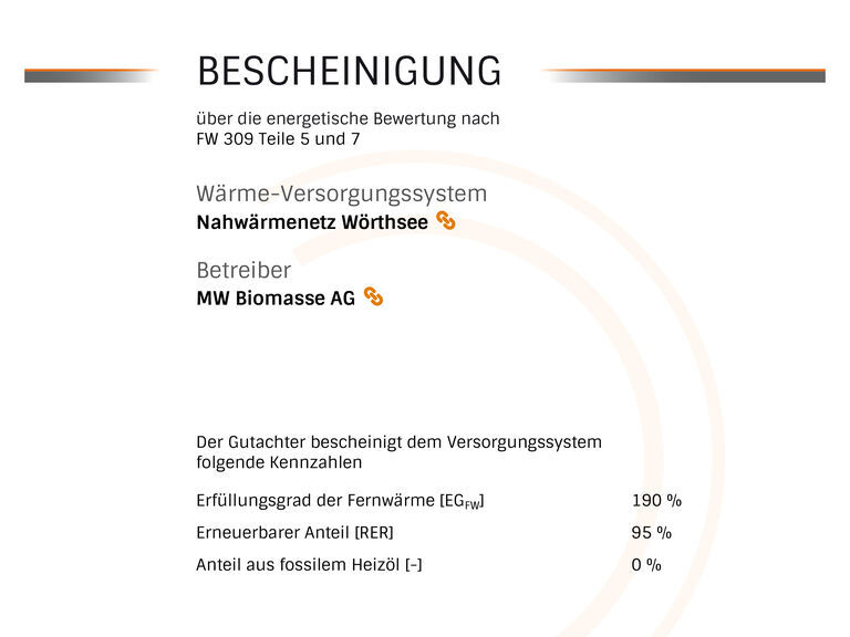 Nah- und Fernwärmesystem werden oft von mehreren Erzeugungsanlagen und verschiedenen Energieträgern gespeist. Im Falle der Anlagen der MWB kommt der weitaus größte Teil aus Hackschnitzeln (erneuerbarer Anteil) und ein kleiner Teil aus Heizöl oder Erdgas (nichterneuerbarer Anteil). Dieses Verhältnis der Anteile wird durch den Erfüllungsgrad der Fernwärme ausgedrückt. Dieser Erfüllungsgrad ist ähnlich wie der Primärenergiefaktor eine netzspezifische Kennzahl, mit der dann die Nachweise für die angeschlossenen Gebäude erbracht werden können.