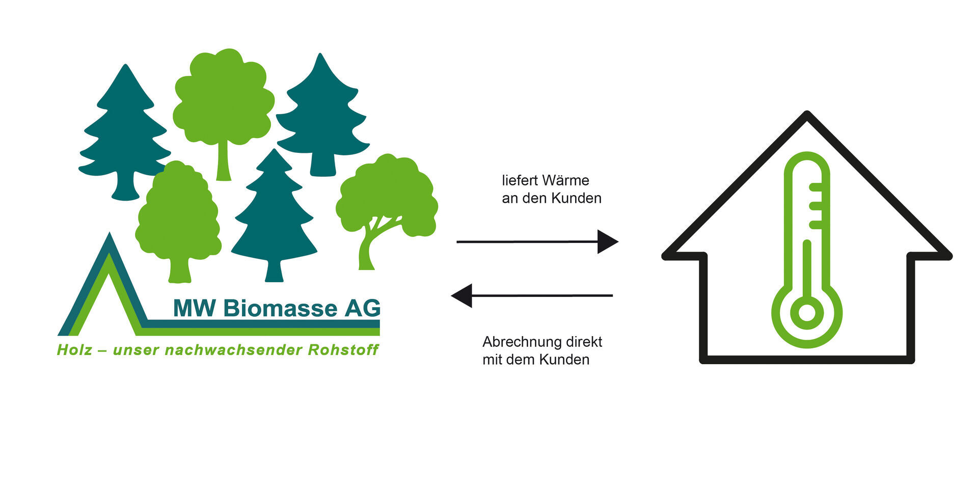 Die MW Biomasse AG errichtet das Heizwerk, betreibt, wartet und repariert die Anlage und die liefert die Wärme an die Kunden im eigenen Namen.